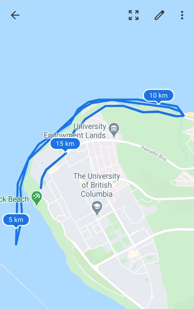 Trevor was back up and paddling but my brother seemed to be floundering in the water still, so I turned back to make sure he was okay. He held up a broken paddle, just a shaft with no blade. Fuck! I offered to tow him back with my leash but (thankfully) he declined. Fortunately, we were just offshore from Wreck Beach. my brother called out that he would paddle into shore and then we could drive around to pick him up.