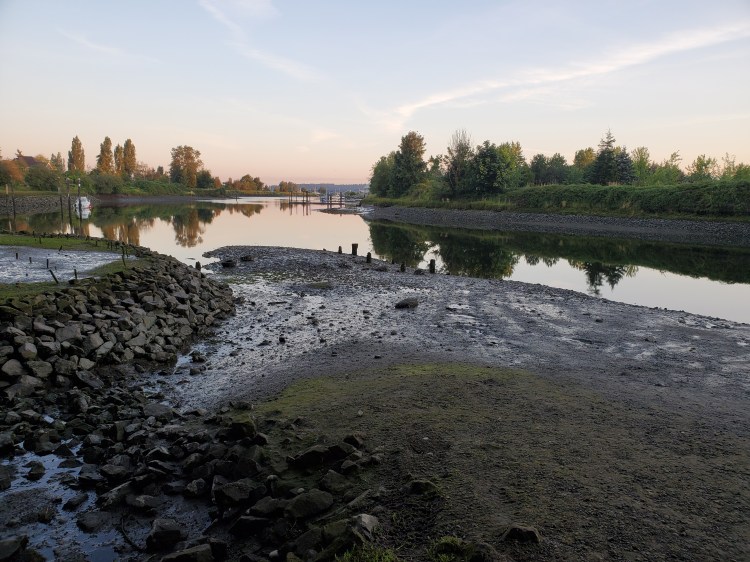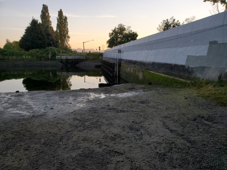 When I arrived I took a quick peek on the upriver side of the sea dam as that is Phase II of the Nicomekl and it is a paddle for a future date. The tide was low and I almost took a header walking down to the water over the super slippery mud.