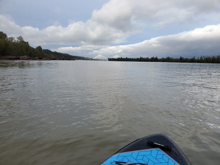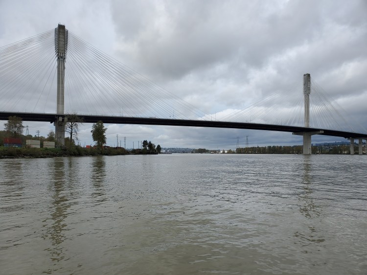 I encounter tug number two on the other side of the Port Mann Bridge. Again it is coming towards me. The wake is big but not as big as the first one. The Fraser River is wider here and I am thankful as there is another boat of fisherman and I do not think my ego would handle another spectated unplanned water entry. Their boat rocks through the wake and as I call out to see if they have caught anything one of them calls back and shows me that his line is active. I do not stick around to see what he brings up.