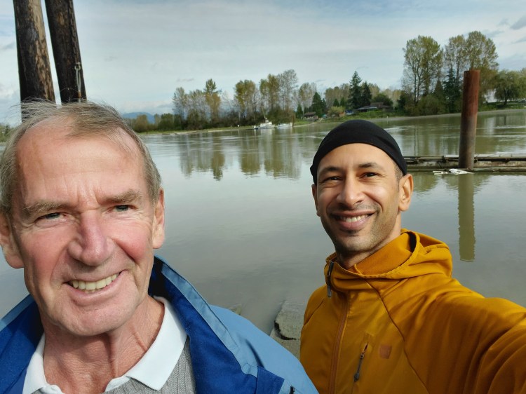 I pass under the bridge and I am momentarily confused as to whether I was to pass under the Skytrain SkyBridge too or not. A man is waving encouragingly to me from the riverbank. That is nice of him, I think to myself. Oh wait, I know him! It is my father-in-law. I steer in towards the beach that he is flagging me towards.