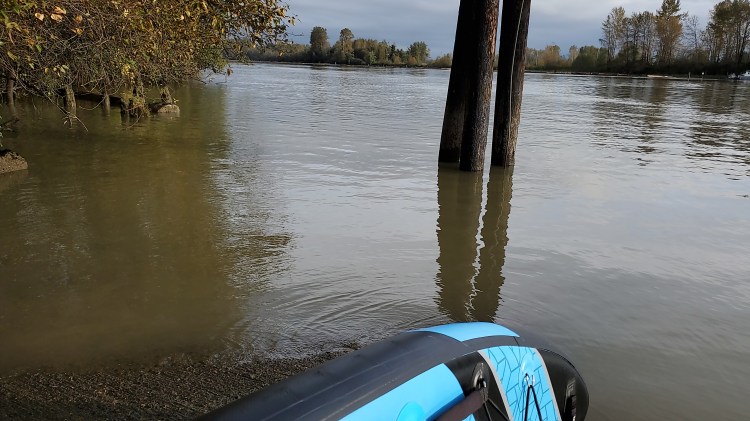 At the same time that I was ready to depart the Barnston Island Ferry was about to leave too. Initially, I waited on the riverbank as I didn’t want to be in the wake of the ferry. But, after assessing the situation I assumed that I was sheltered enough, that the ferry was going at such a slow pace that the wake would be negligible and that the ferry would do a linear point to point so that the cars onboard could easily drive off. Oh, how I was wrong! Only now do I know that after drifting away from the dock with the river current the ferry takes off in reverse! This created a massive eddy current that swirled towards me just moments after I had stood up on my board and started to drift along with the current too. Before I could get my footing the starboard side of my board was sucked down into the eddy. I tilted hard to the right and the next thing I know I was jumping (okay fine falling) off my board into the muddy waters of the Fraser! In hindsight, I wonder if I had been more prepared for the eddy if I could have braced myself, but I suspect that I am just trying to protect my ego with such a presumption. Below is a video of the ferry departing taken by my father-in-law when we came back to pick up my vehicle. Listen to my commentary explaining how I was unwittingly sucked in (sorry that I don’t have live spill for your entertainment but if you can contact a youth cycling group that was on the Barnston Island Ferry the morning of October 17, 2020, I am sure they can give you an amusing account). Make sure you watch the video to the end so that you can witness my look of disbelief and then read on to see what the heck I am looking at!