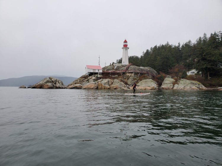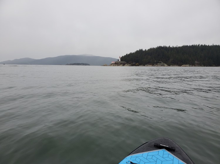 The paddle over to Point Atkinson was pleasant with mild conditions and pacific (😉) conversation. We had a time constraint in that Trevor needed to pick up his kids at 1300, so at about four-fifth of the first crossing, we needed to decide whether we could make it all the way and then back. The current was now aiding us along, but that meant we’d be fighting it for the way back. We decided that we would have enough time if we pushed the tempo and turned around to come back as soon as we arrived. The conversation stalled, and we put our heads down and started to paddle.