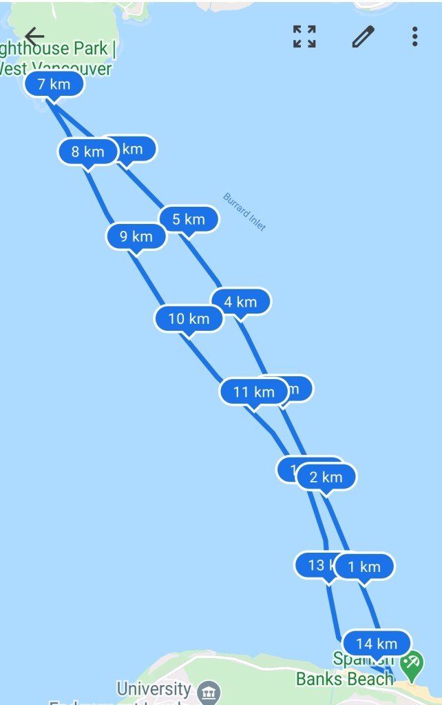 If Bowen Island is in the cards, my plan would be to leave from Spanish Banks. This would allow me to take an Evo Car Share down to my launch point so that I do not need to be dropped off or take away our single-family car. From Spanish Banks, the plan would be to cross the Burrard Inlet to Point Atkinson, then head to Passage Island before continuing on to Bowen Island near Apodaca Provincial Park. So, with a little bit of time and no wind to seek out today, Trevor and I decided to give the crossing a go and do some reconnaissance.