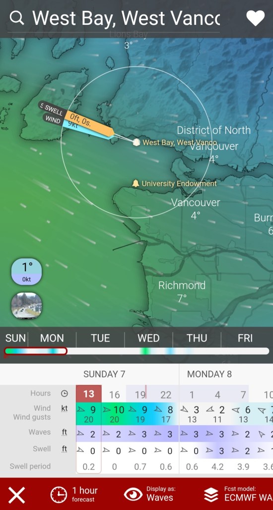 It was gorgeous out when I arrived at Caulfeild Cove. There were some waves on the water so I decided to give downwinding a shot. I assumed that the wind would be stronger later in the day, as per the forecast, and with the changes in air temperature/pressure creating an inflow in the fair-weather sun. In addition, I would be further into the fetch and past the wind protection provided by Point Atkinson.