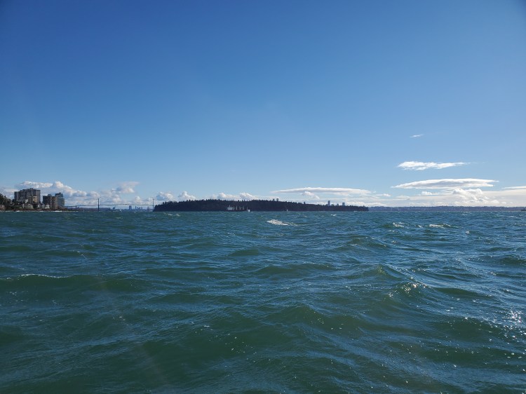 The wind started to pick up as I passed the first ship moored off the coast of Stearman Beach. And by the time I made it to the second ship, the one visible in the photo above, things were starting to get interesting. A little bit later I stopped to take a few more pictures. In the image below you can see a few white caps starting to form as I get further into the fetch. I am closer to West Vancouver and there is a tanker ship leaving the Port of Vancouver just in front of Stanley Park. One was also approaching from behind heading into the port, but it is out of the photo frame.