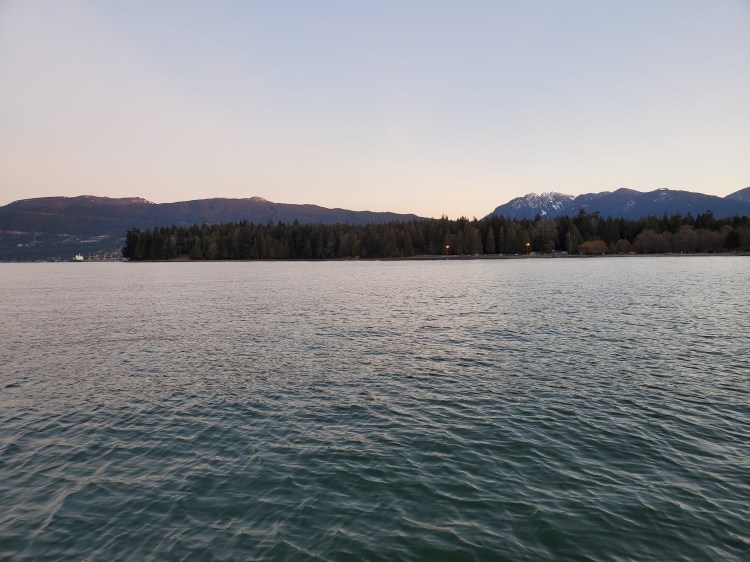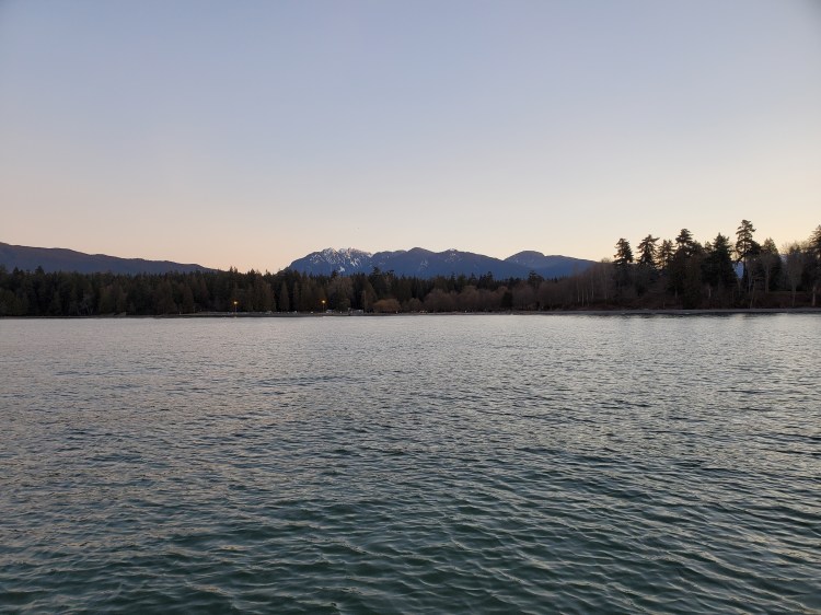 Here is the view of Stanley Park with the two lights bordering the Second Beach Pool. The Grouse Mountain area is in the centre background. The snow-covered cliffs of Crown Mountain are leftmost, then moving rightward there is Goat Mountain, Dam Mountain, Grouse Mountain with the Eye of the Wind barely visible on top, and lastly Mount Fromme rightmost in the background. The eastern tip of the Cypress Mountain group is on the left.