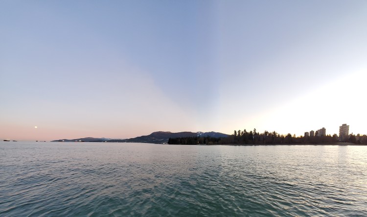 And below is a panoramic view with the West End towers on the right, Stanley Park centre, the North Shore Mountains in the background leading out to West Vancouver and Point Atkinson, and then Bowen Island in the left background with a setting moon.