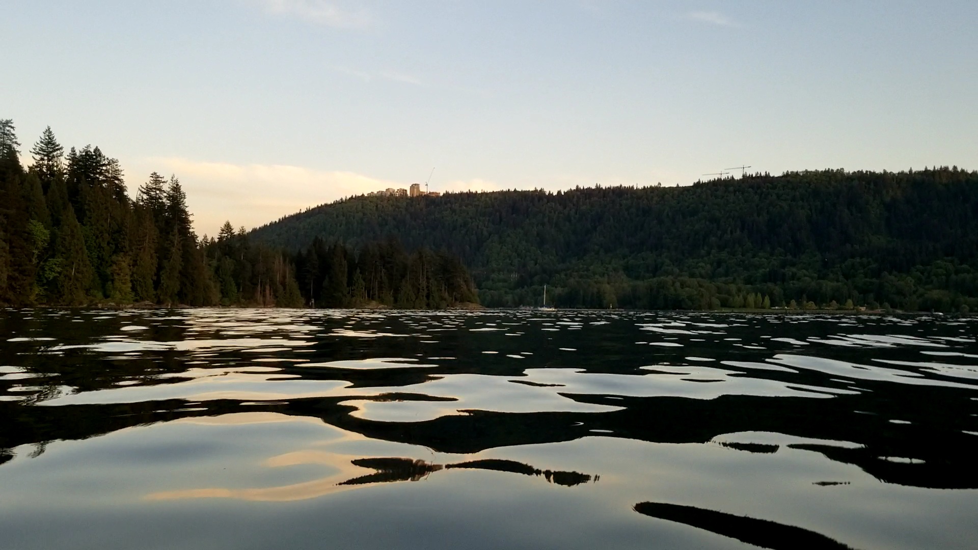 East of the point is a small bay that lies between Admiralty Point and Burns Point. Below the photograph shows Burns Point in the distance with Burnaby Mountain in the background. You can see some of the buildings from Simon Fraser University (SFU) along the skyline.