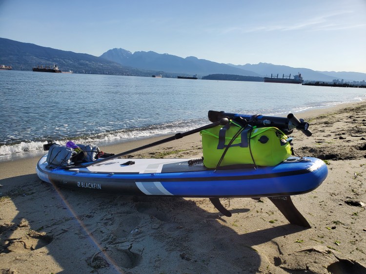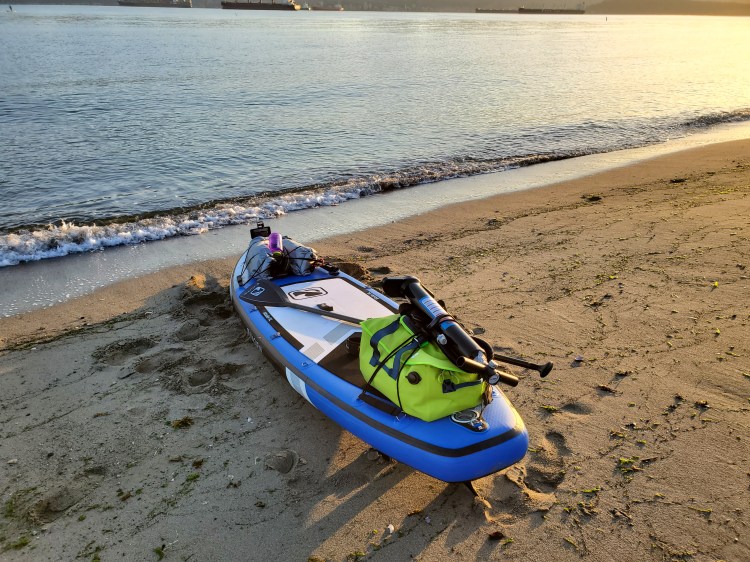It took a bit of organising but I managed to get all my gear loaded and secured to my board. I ended up using two 20 litre rolldown dry bags and one 30 litre duffle style dry bag. Since I wanted to mock up a real trip to get a feel for how the board would handle and see how I would pack all my gear I brought a spare three-piece paddle and pump. I taped the paddle together with electrician’s tape. I picked that tip up from this SUP Boarder video. They have an excellent four-part series on SUP touring. For the pump, I sealed off the intakes/outputs on both the hose and pump with duct tape. I wasn’t sure if this was necessary but better safe than sorry. Since I didn’t have my Grayl Geopress yet I brought a Nalgene water bottle. And then I brought a clog-style water shoe that I tucked underneath the dry bags at the front of my board. I used carabiners to secure all the bags to the bungees cords on the board, just in case I tipped over.