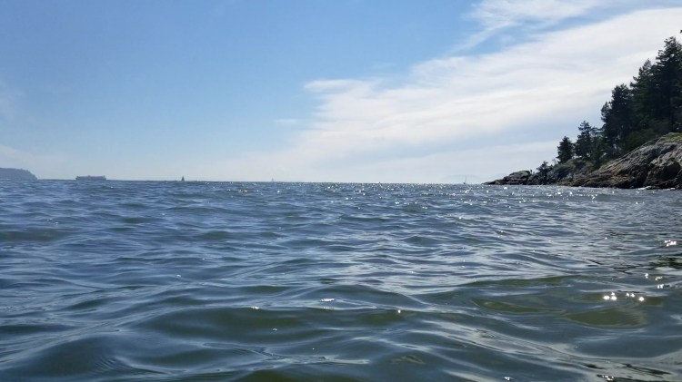 The forecast on Windy.com was a southeasterly wind so I decided to head out into the wind around Lighthouse Park so that I could catch a few rollers on my way back to the cove. As I set out there was a for sure a headwind and some light chop. The picture below is the view out of Caulfeild Cove with the eastern shore of Eagle Point on the right.