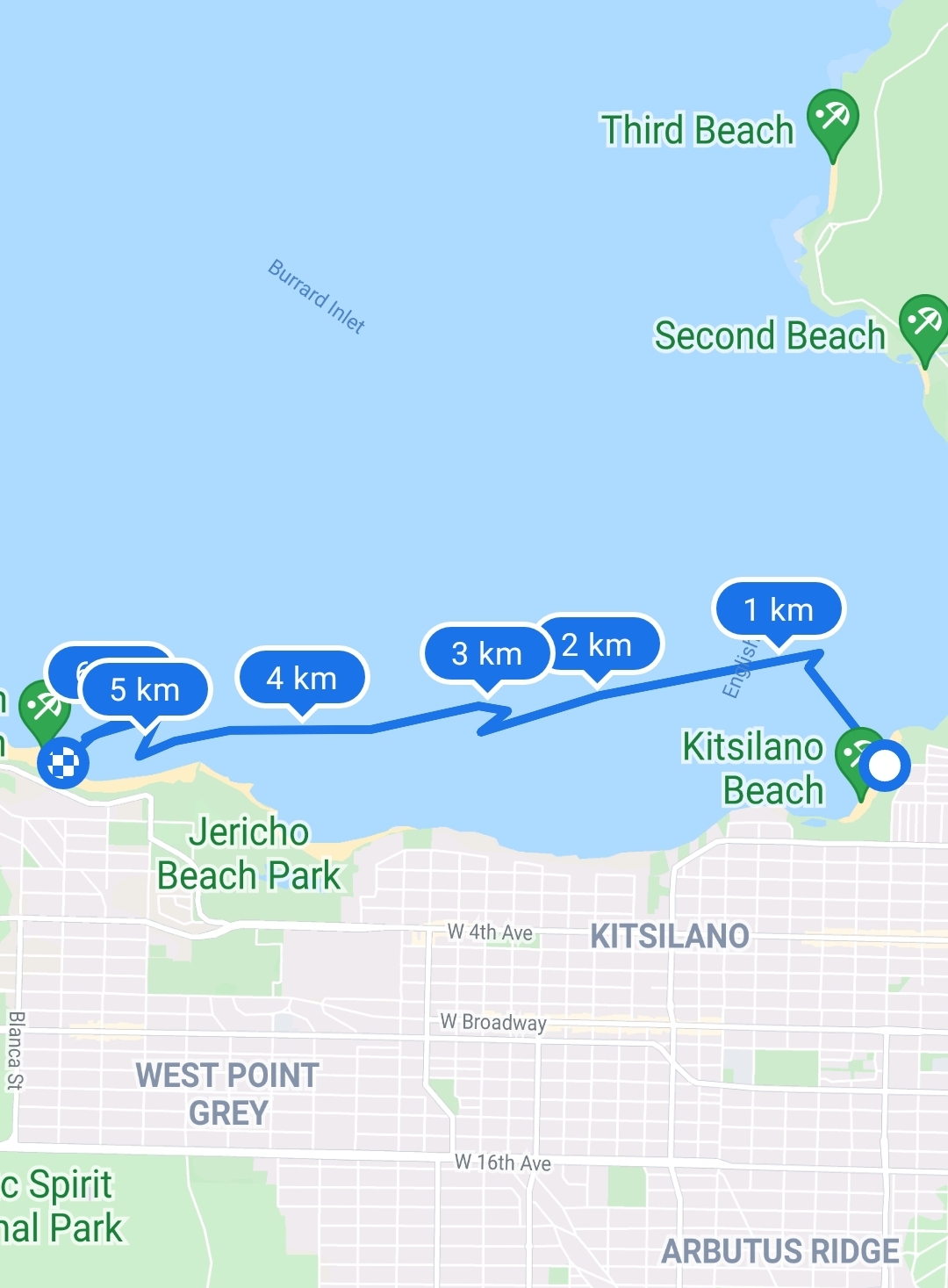 We did another small jaunt upwind as the conditions here were feeling pretty good. Then it was off towards Jericho and Locarno Beach. Just before we started to head westward again, I realized that we hadn’t yet booked our return Evo car. Luckily, when I opened the app there was one waiting perfectly situated between the parking lot at Locarno Beach and the Spanish Banks East Concession.