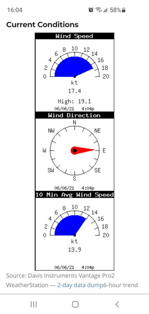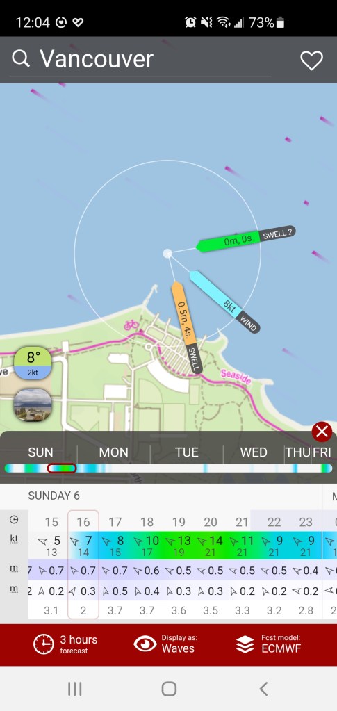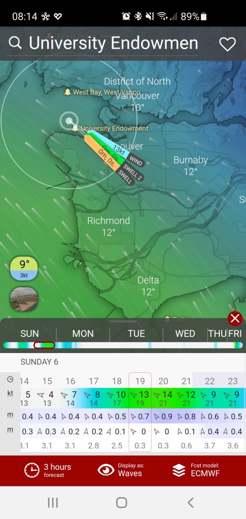 With the waves looking to be stronger earlier in the evening, we decided to aim for around 16:00 to launch. Just before leaving my place to meet Trevor, I checked the conditions on the Jericho Sailing Centre to get some real-time data. The wind was up and coming more from the east which would be to our advantage.