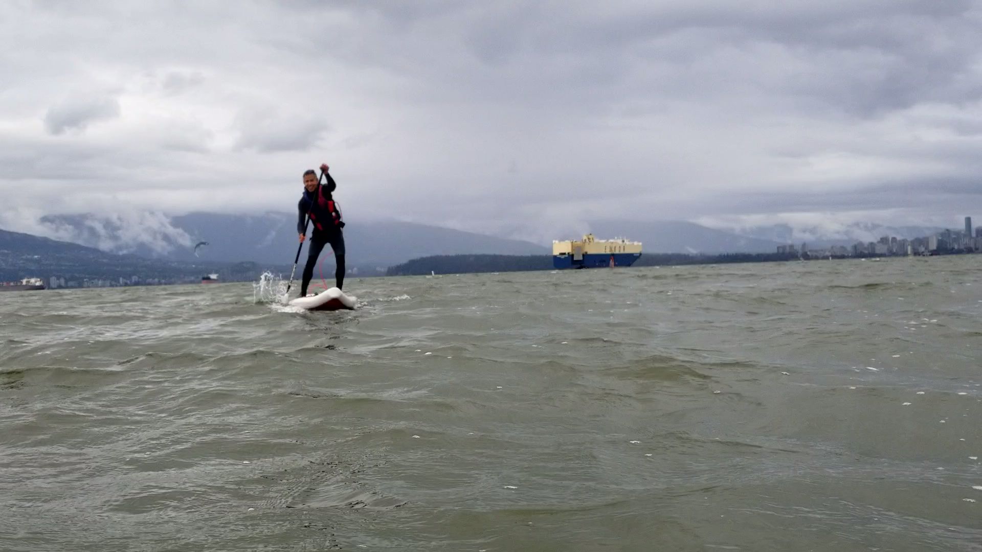 We started by paddling straight out into English Bay. Little ways offshore the wind and waves were starting to pick up. We decided to head upwind for a bit before turning around to head downwind. The upwind chop is a nice way to wake up your sea legs. The picture below is Trevor making his way upwind.