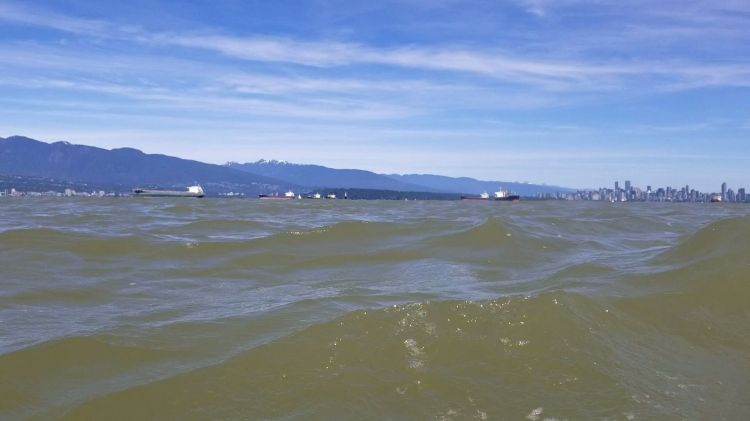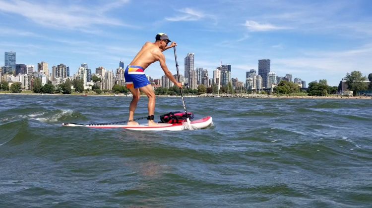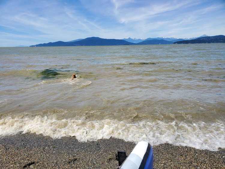 Here is the view from the shoreline looking northwest with Bowen Island and the Sunshine Coast in the background. There is a dog in view also braving the waters. Though we hoped to spend more time on the high side and dry side of our boards.