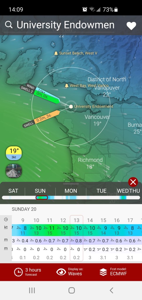 Soon after Annie got home from her work shift I was off to meet Trevor at Vanier Park to set up our ride logistics for a Span-Kit Downwinder Run. Though I guess this technically would be a Span-Van Run. Below is the forecasted wind and waves for Sunday afternoon from Windy.com. Nothing huge with 0.8 m waves but there would be a long line of them.