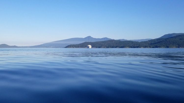 I checked my position. If the Google Map was correct, I wanted to position myself right in the current trajectory of the oncoming ferry. That way when the ferry made its turn southeastward off of Hood Point, I would no longer be on a crash collision course with a 20,000-tonne vessel barreling toward me at 15 to 20 knots. Below is the image of the ferry approaching. It was just slightly nerve-racking watching it approach as I sat bobbing in the water waiting for it to turn.