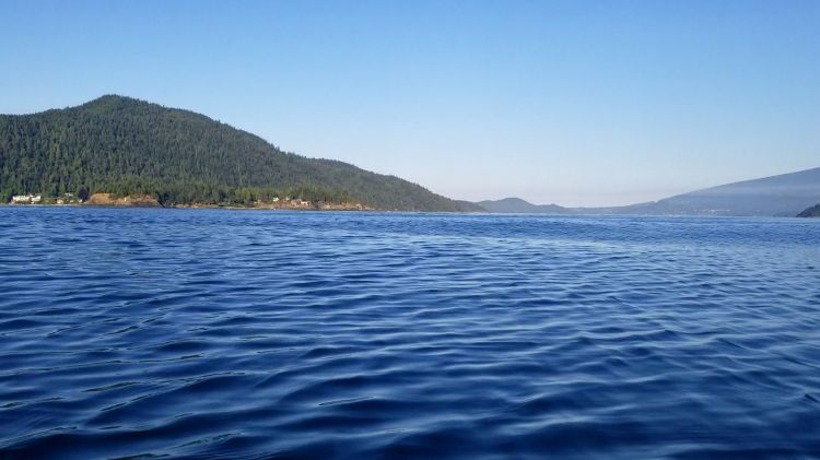 When I reached the southwestern tip of Bowyer Island I stopped for water and a snack. Below is the view northward from the water there with Bowyer Island on the right, with Mount Wrottesley rising above in the background.