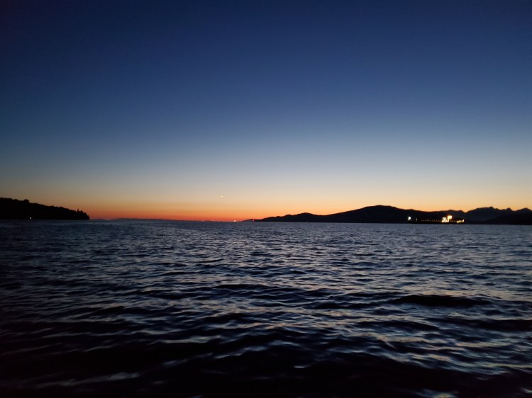 I also took a moment to capture a photo of the Moon. The Moon is over the top of West Point Grey. It’s a bit blurry in the image due to the low light and wave turbulence, but you get a sense of the atmosphere with the light glistening on the water.