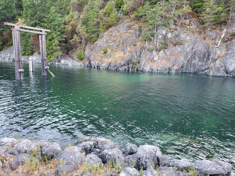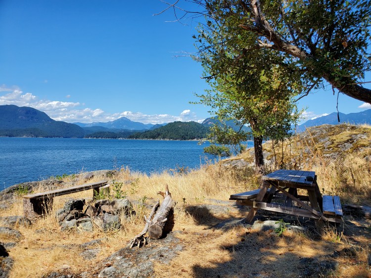 I was happy to find the picnic table shown in an image from the BC Marine Trails website still there. Though, it seemed to have been repositioned. I was happy to have it in a more shady area. There were also two benches and a rock campfire pit.