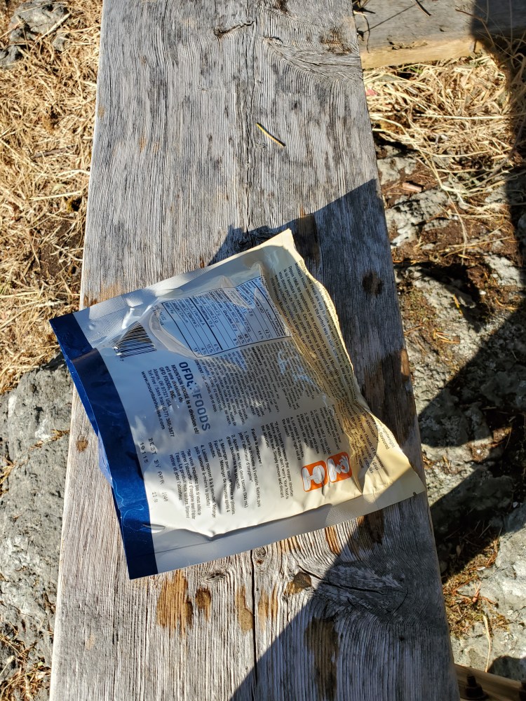 It was another dehydrated meal for dinner. This time Sweet and Sour Pork by Mountain House. Funnily, when I had first purchased these meals, one of our kittens did some investigating and had punctured the bag. I had quickly removed the bags from the kitten’s reach and then put them aside where they couldn’t access them. And when it came time to pack, remembering this, I tried to find which food pack had punctured. But I couldn’t find any holes. I found them quickly as soon as I pour the boiling water into this packet. The top left corner in the image below is where I sprung a leak. Luckily, there was no harm done with the hot water.