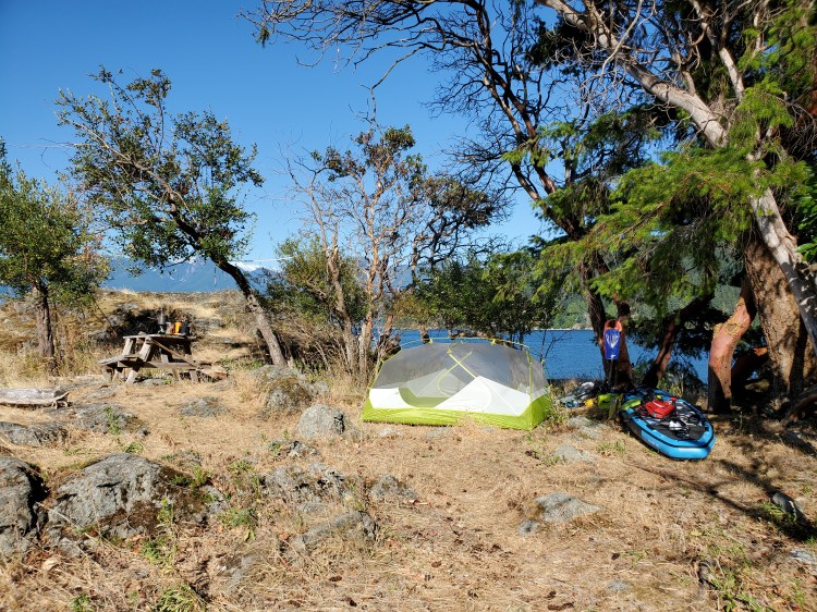 Before calling it a night, I did need to answer nature’s call. I vaguely remembered reading something on the BC Marine Trails site about leaving no trace. And from memory, that included no digging, which posed a dilemma. Fortunately, we had some doggy-doo bags leftover from our children’s diaper days that I had packed to use as garbage bags for this trip. Wrapping up your child’s waste in an airtight bag until you could find a proper disposal place was a trick my sister-in-law had shown us. I put a similar rendition of it into play here. But that was something that I failed to take into consideration before embarking on this trip. A small island with no outhouse and a leave-no-trace directive puts you in a bit of a pickle.