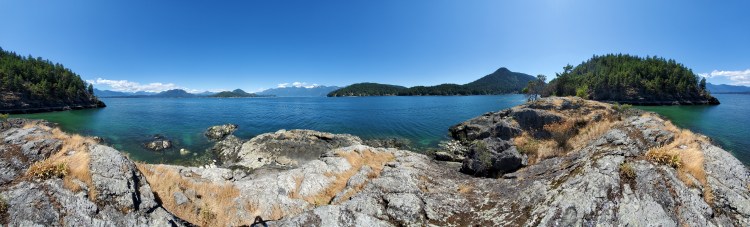 Once on land, I surveyed the landscape, trying to determine where to stow my board overnight for the tidal shift. I made my way to the northern tip of the island to take the panoramic photos below. Hutt Island is visible on both the right and left of the image (there is a slight overlap), with Gambier Island in the centre and the Sunshine Coast in the distant background.