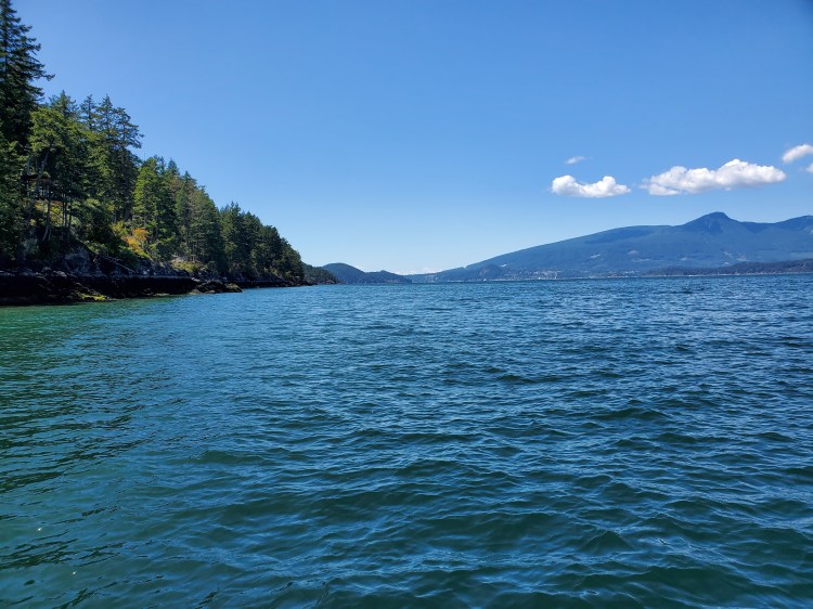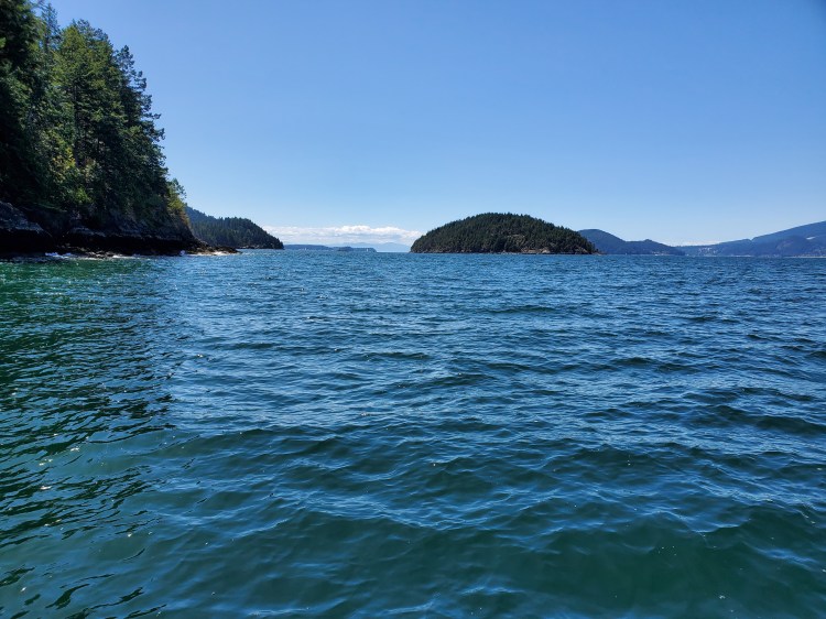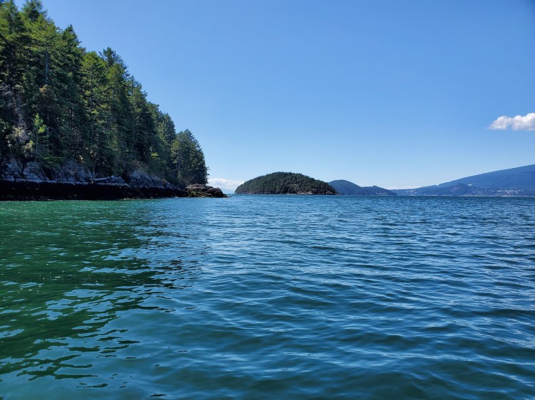I was then into the Queen Charlotte Channel on the west side of Passage Island. The waters here changed again, and in one section, I almost came off my board with the mixing currents. With Bowyer Island off in the distance, I couldn’t resist taking a quick photo. Bowyer was my first island circumnavigation, so it was a nostalgic moment as I set off on this quest.