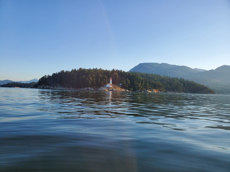 Here is the view from a bit further out in the inlet with my first three destinations on site. The Point Atkinson Lighthouse is on the right, Mi’tlmetle’lte (Passage Island) is in the centre foreground, and Bowen Island is behind it. Already the water is getting more textured as the day goes on, and I am more exposed to the open water.