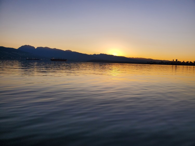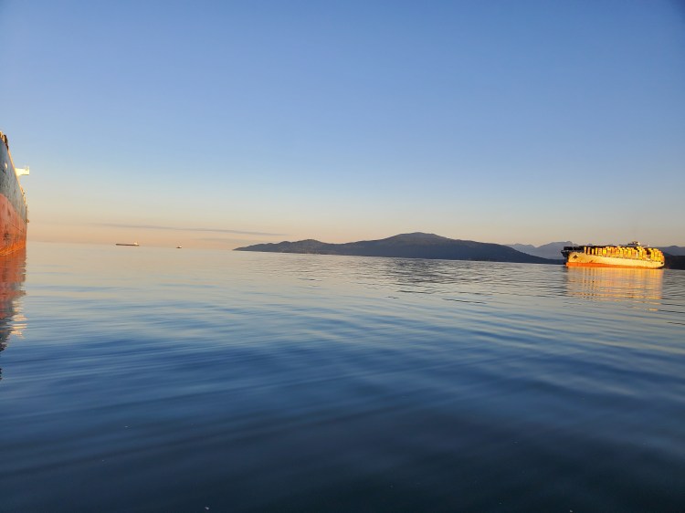 I made my way out past some of the moored freighters in səl̓ilw̓ət (Burrard Inlet). I could see the eastern side of Bowen Island far-off in the distance. A straight line would be faster, but I would be crossing a deep-sea transit route, so I wanted to cross perpendicularly to minimize my time in the pathway. I did another visual check for vessels and a digital check on the Marine Traffic site. Still clear, so I made my way across the inlet, quickening my pace.