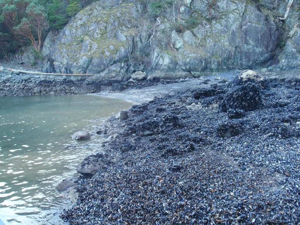 After a mix of head-down paddling, Connor Baxter’s “Choke Stroke“, and some kneeling paddling to reduce my windage, I was within striking distance of Little Flower Islet. The BC Marine Trails site suggests landing on the southeastern side of the tombolo connecting Hutt to Little Flower Islet, particularly at low tide. It is a shell-based landing with the path to Little Flower Islet lined with mussels.