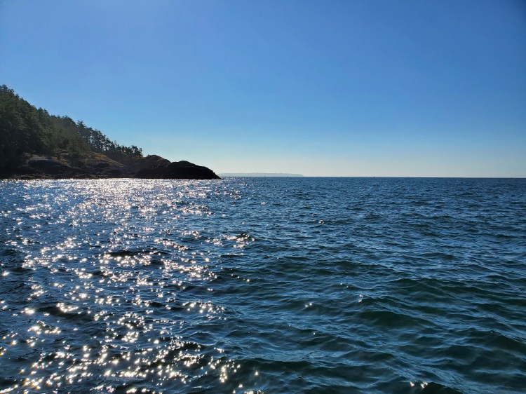 As I rounded Arbutus Point and made my way across Bowen Bay, the wind and waves picked up. I was now fully exposed to the incoming winds and water of the Salish Sea. There was moderate southwesterly wind, so it was a battle to made headway. I contemplated paddling further into the bay for wind shelter but decided to continue straight ahead, taking on the crosswind.