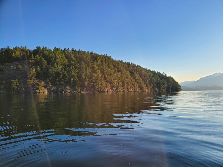 The sun was now up and peering over the top of Little Flower Islet as I departed, making my way into and down Collingwood Channel.
