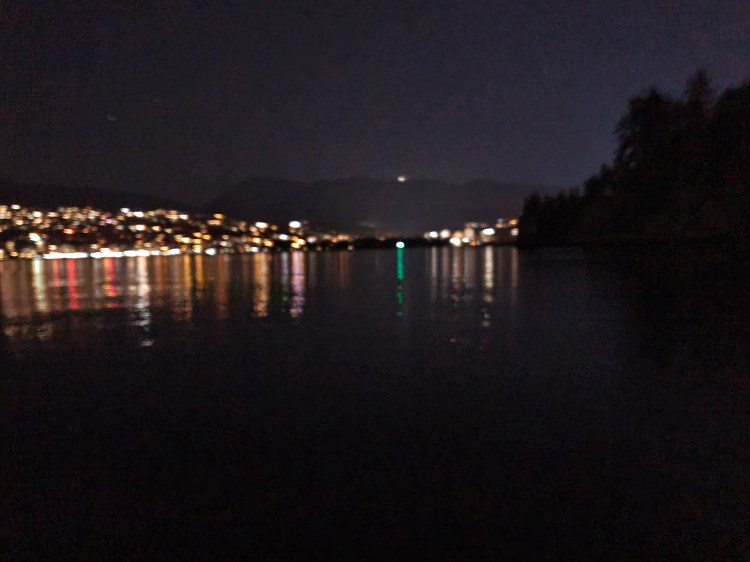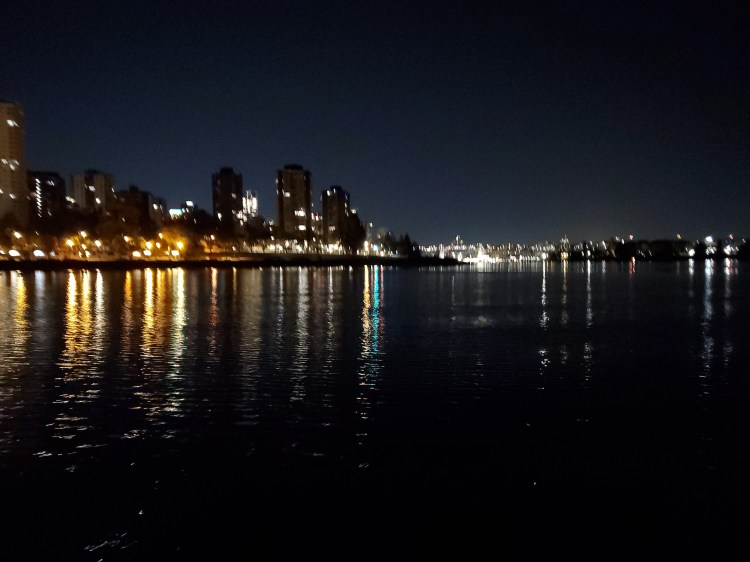 The view westward out toward Point Grey and the Strait of Georgia was much less luminous. With the scattered ships lighting the waterline of Səl̓ilw̓ət (Burrard Inlet).