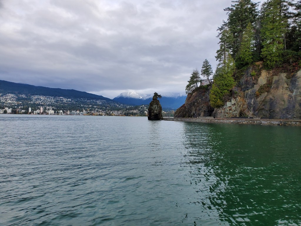 As I approached Slhx̱í7lsh (Standing Man Rock), I could see that the North Shore Mountains in the background had received a recent dusting of snow. A sign of the approaching ski season.