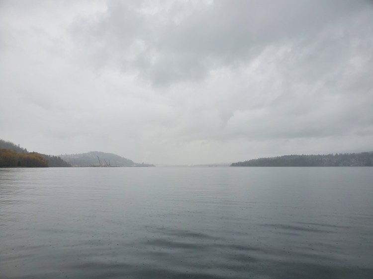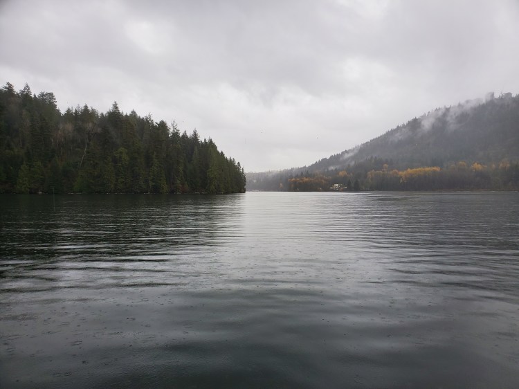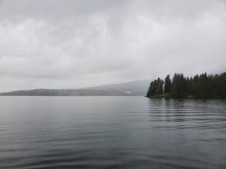 The rain was light crossing Səl̓ilw̓ət (Indian Arm), but as I rounded Burns Point, it started to pick up. I tried to get an artistic image of the pitter-patter of the rain on the surface of the water. That image is below.