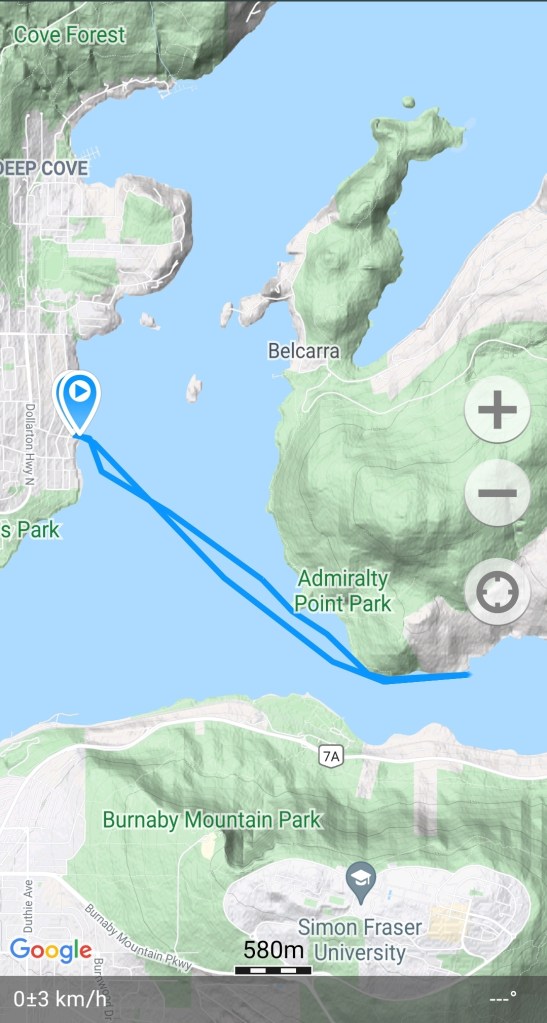 We were in North Vancouver visiting my in-laws today. So, I was able to take advantage of being on the north shore and get on the Səl̓ilw̓ət (Burrard Inlet and Indian Arm) waters. It has been some time since I have paddled there. In the summer, I was there frequently completing the virtual Tuesday Night Race‘s (vTNR) put on by Coast Outdoors through Deep Cove Kayak. See this post for details. But as of late, I have been paddling closer to home, still in Səl̓ilw̓ət (Burrard Inlet).