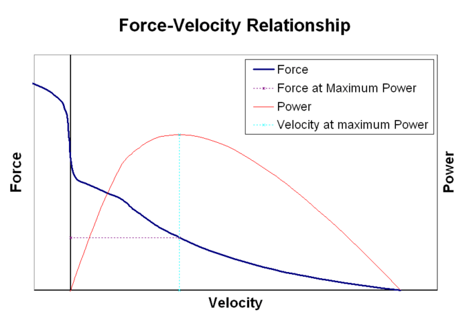 Furthermore, the power production of a muscle is also governed by the force-velocity relationship. Optimum power output occurs at one-third of maximum contraction (or shortening) velocity (see graphs below). This phenomenon is a result of the subcellular biomechanics of myofilament coupling. Borrowing again from the tug-of-war analogy, this is akin to the optimal speed of changing over your hands to pull or release the rope. Too fast, and you are not able to get a solid grip and too slow, and you are inefficient in the tugging battle.
