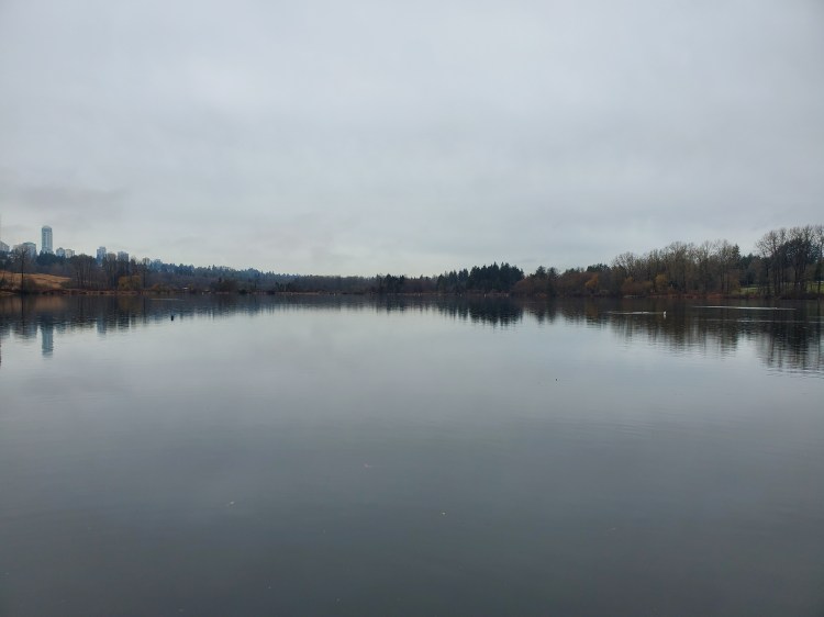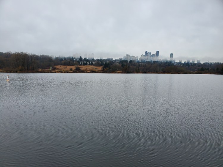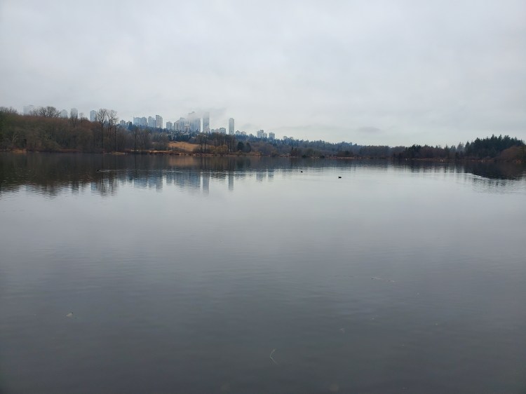 I could see some tall towers off in the distance under socked-in skies. I believe the buildings are part of Metrotown. It is a fascinating contrast between a more raw nature setting and the towers of urbanization. I set out in the direction of counter-clockwise navigation of the lake.