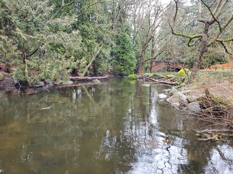 I made my way up along the northeastern shore of Deer Lake, arriving at the headwaters of Deer Lake Brook. The brook connects Deer Lake to Burnaby Lake and is the only outflow of Deer Lake. I found the name of the brook on this document, “Waterways of Burnaby.” I am curious to come back here in the summer. The image on Google Maps satellite shows this section of the lake covered with lily pads. But it was completely clear, now in the winter. There were a few deadheads to dodge and some boulders underwater to pay attention to. The waterway looked like it picked up speed closer to the bridge in the image below, but I didn’t venture far enough to explore. I wondered if it would be possible to navigate the waterway to Burnaby Lake underneath the highway. However, from my previous paddle on Burnaby Lake, I knew that if you were able to cross you would end up in the protected habitat zone. So, I doubted a crossing would be possible.