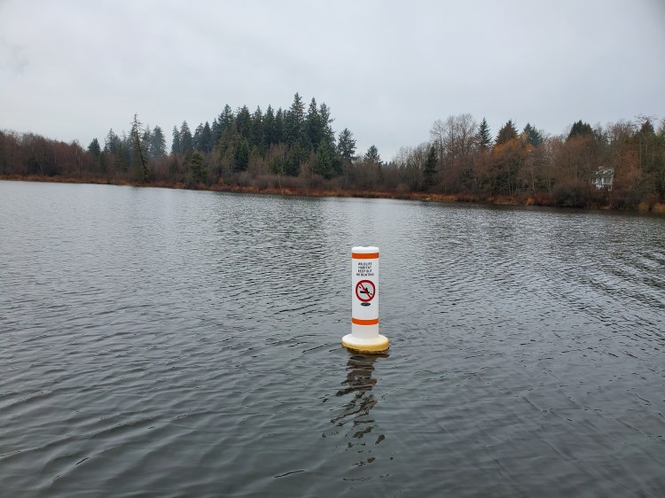 Returning to Deer Lake, I hugged the northern shoreline as best as possible. In the distance, I could see a line of buoys as I made my way westward. I suspected that they were markers for a protected habitat zone like the ones I had seen on Burnaby Lake.