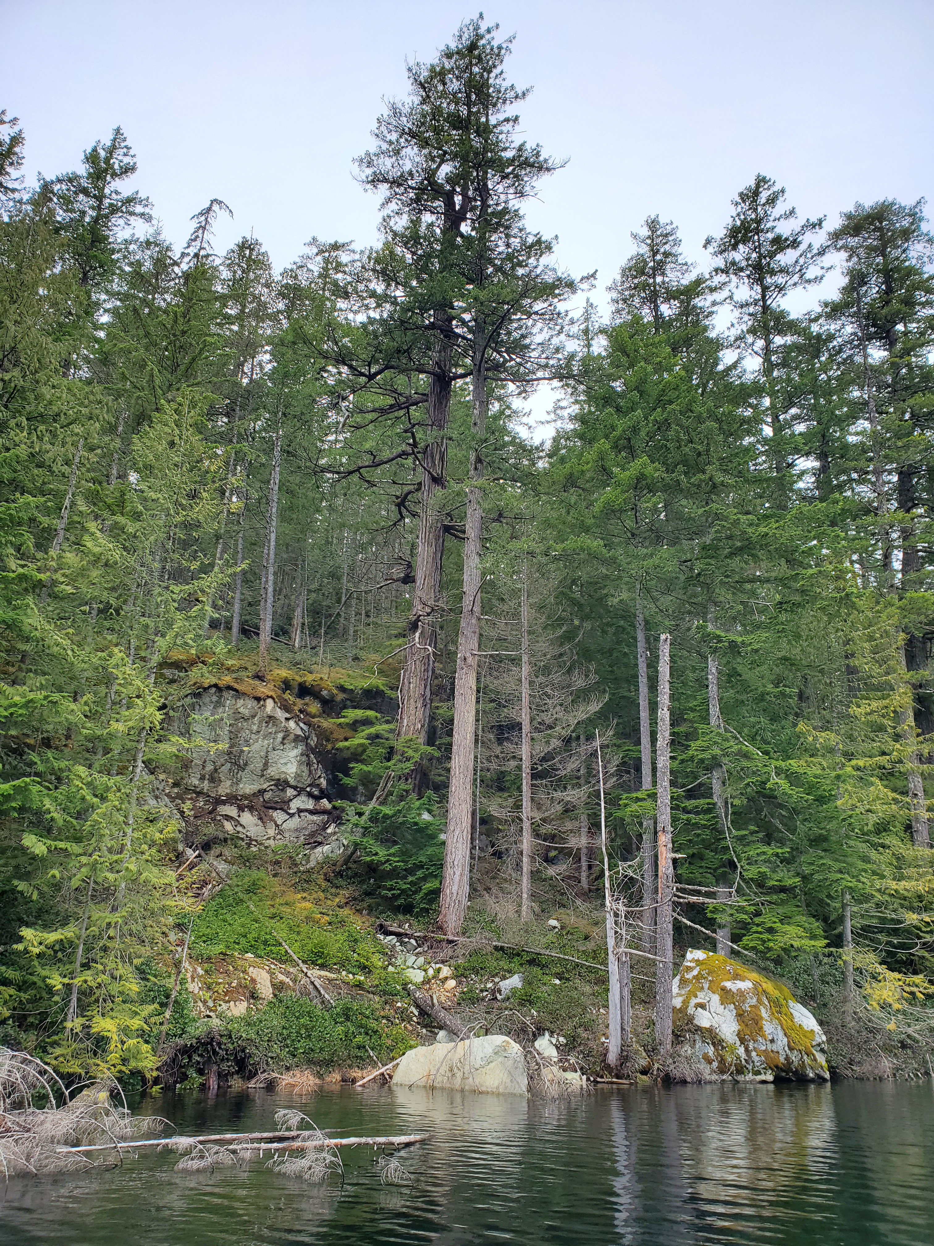 The western shoreline is a mixture of boulders, granite cliffs, and evergreen forests. My memory of the trees along the shore was that there were some deciduous tree sections. But, after re-examining my photos, I think I had mistaken dead evergreens for deciduous trees.