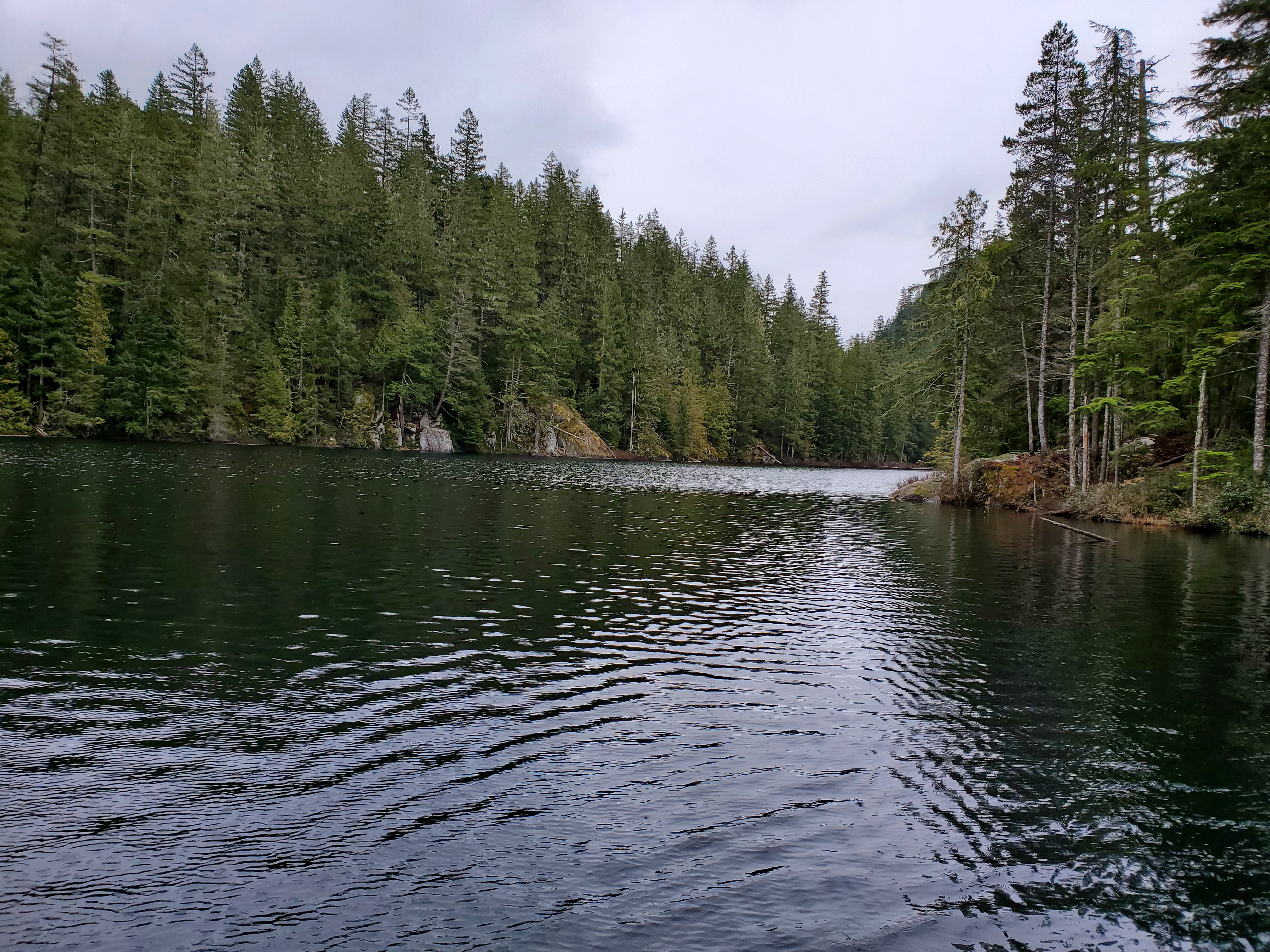 The water was relatively calm. I was the only one out on the water. I did, however, see and hear several hikers going around the perimeter trail. Then north end of the lake was much more peaceful as the Sea-to-Sky Highway traffic was no longer audible.