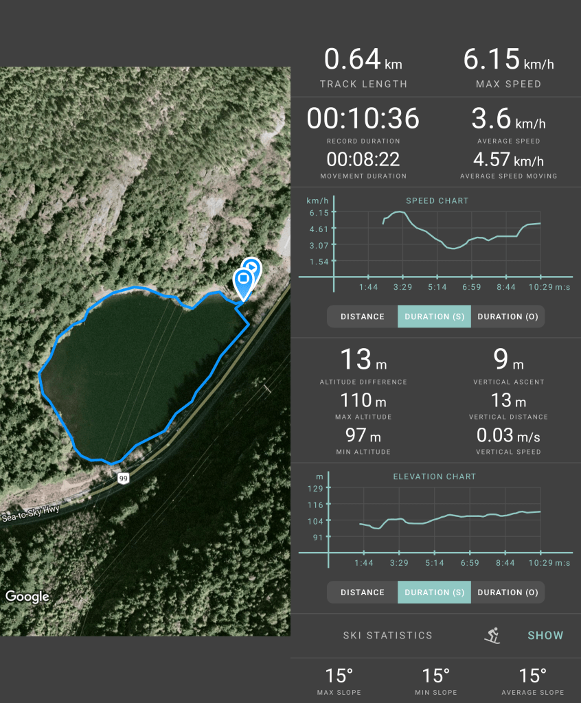 It was a fast trip around the lake. Geo Tracker recorded my distance as 0.64 kilometres. Again, spot on with my estimate of 0.6 kilometres.