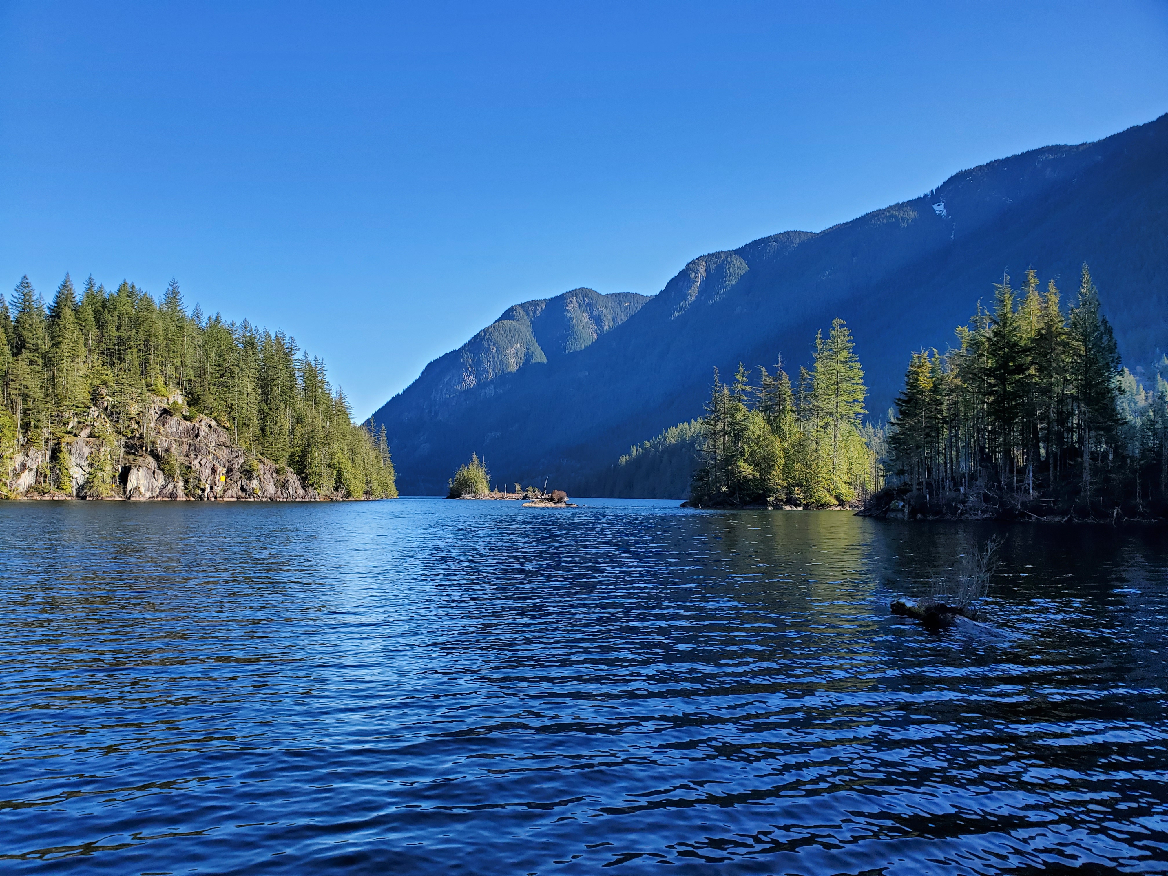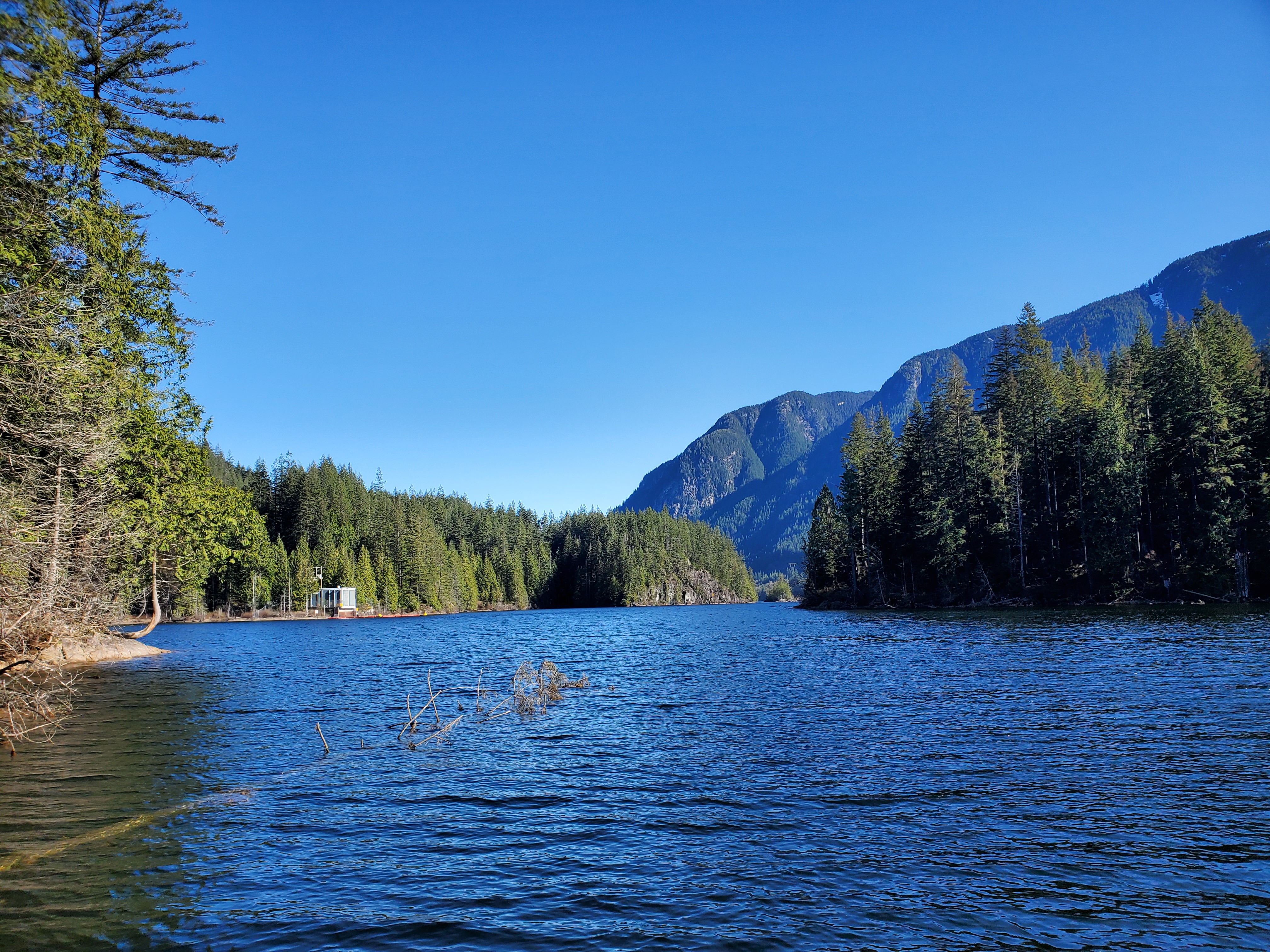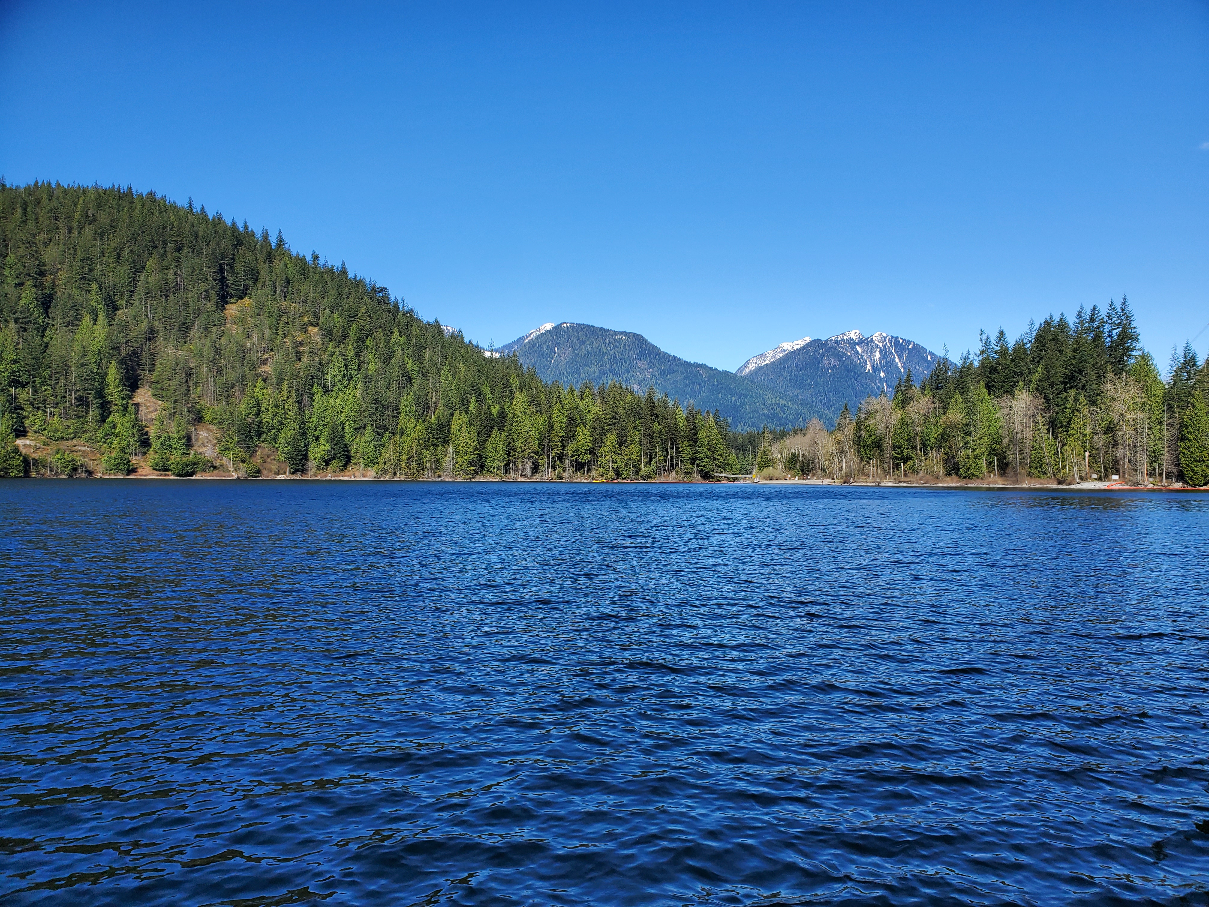 Below is the view northward from the west side of the lake over the trees and across Səl̓ilw̓ət (Indian Arm) toward Mount Seymour Provincial Park. I believe the peak on the right is Mount Bishop and Mount Elsay is on the left.