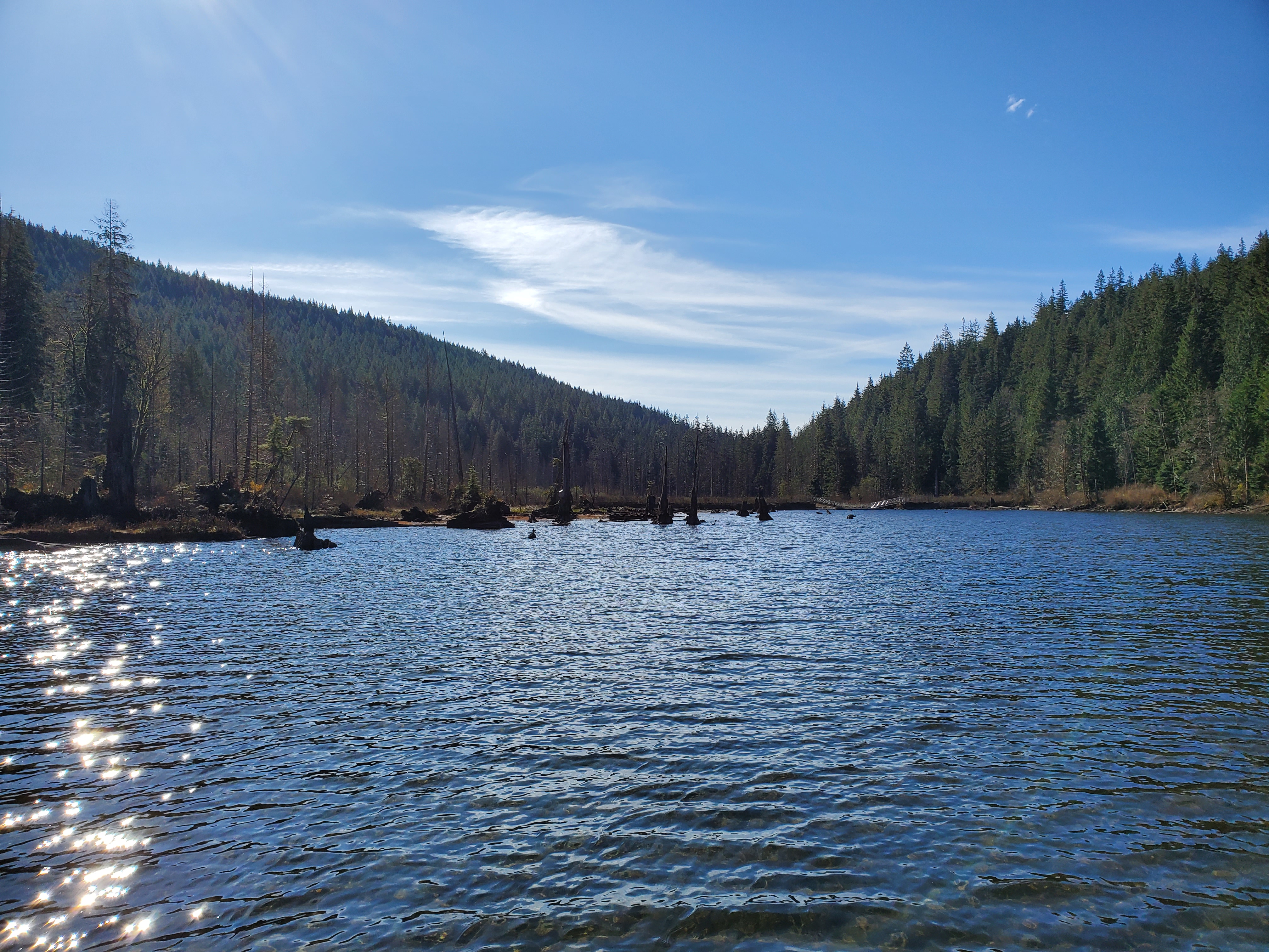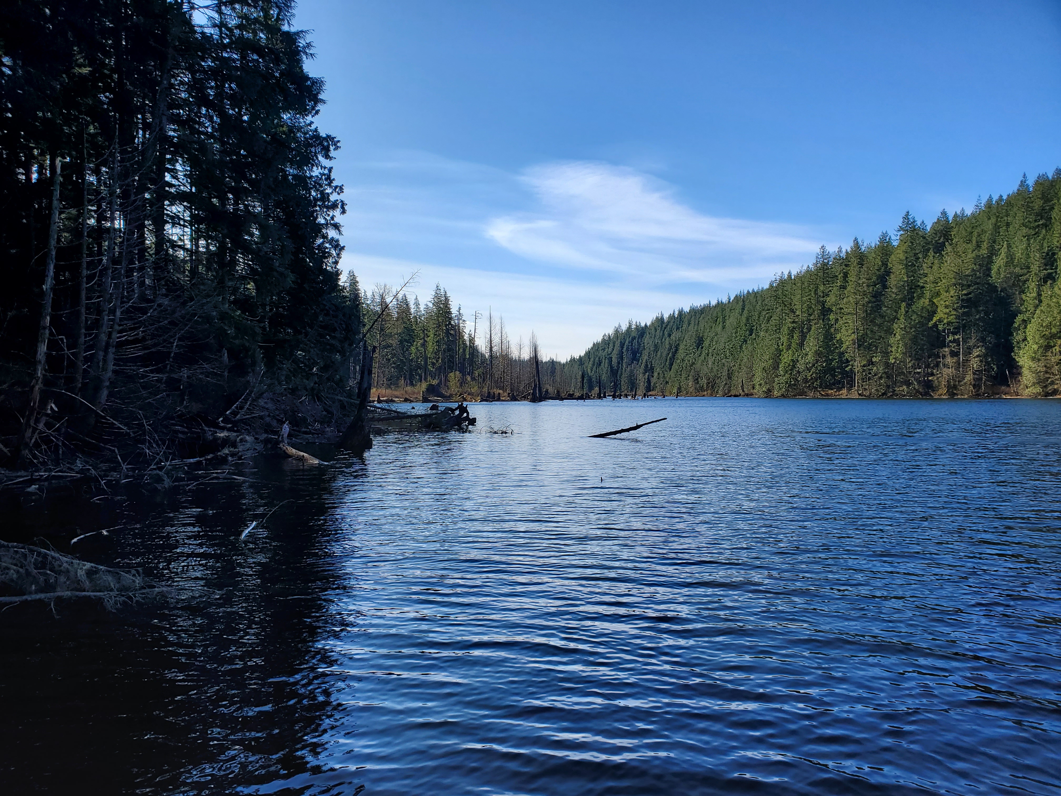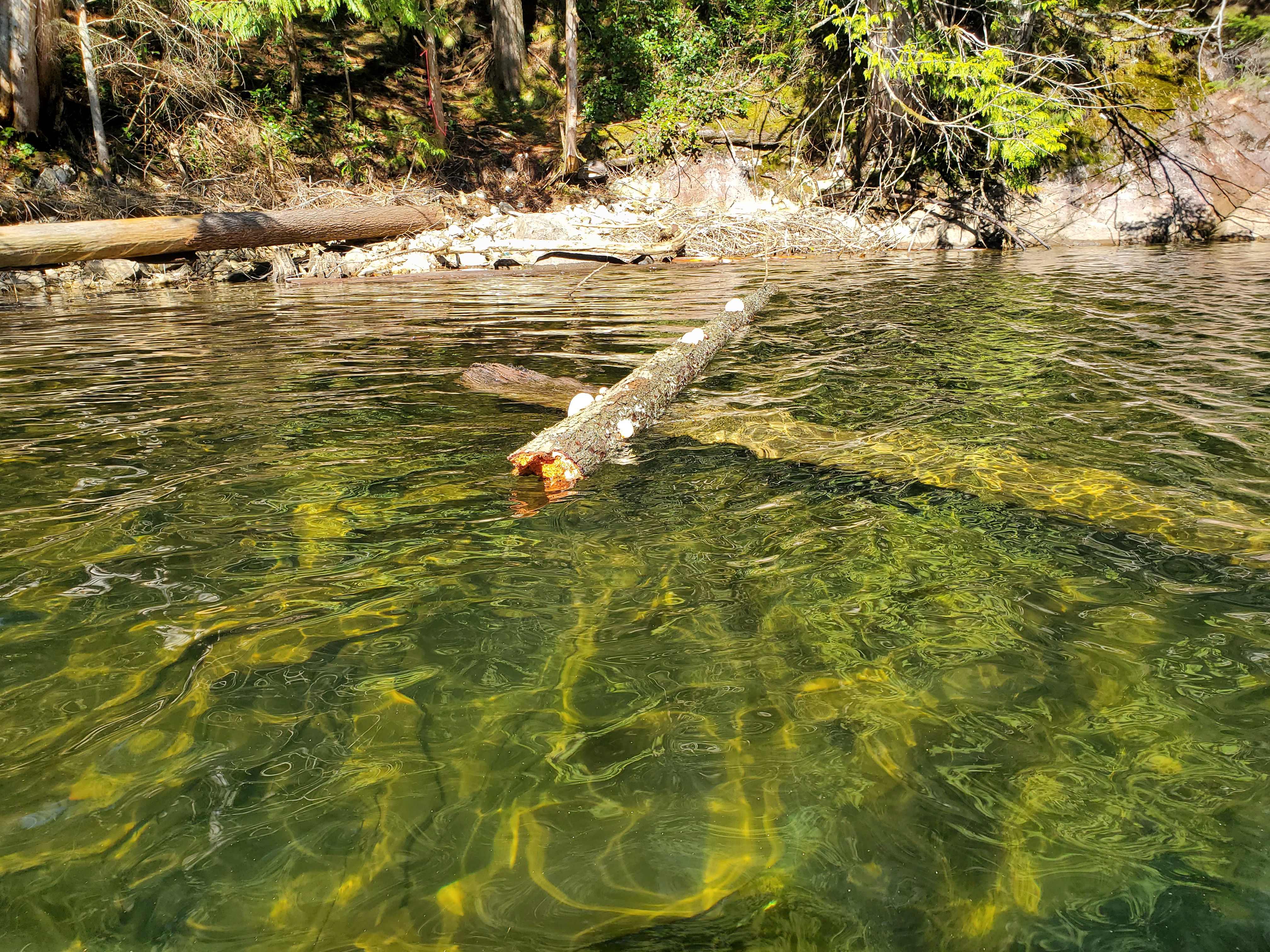 Around the point, there were plenty of deadheads in view. In fact, many of them were stumps poking through the water. I wondered if they had been logged? And I assumed that when Buntzen Lake was converted into a hydroelectric facility, they must have increased the lake size. I figured that was the reason for the submerged forest (flood?) plain.