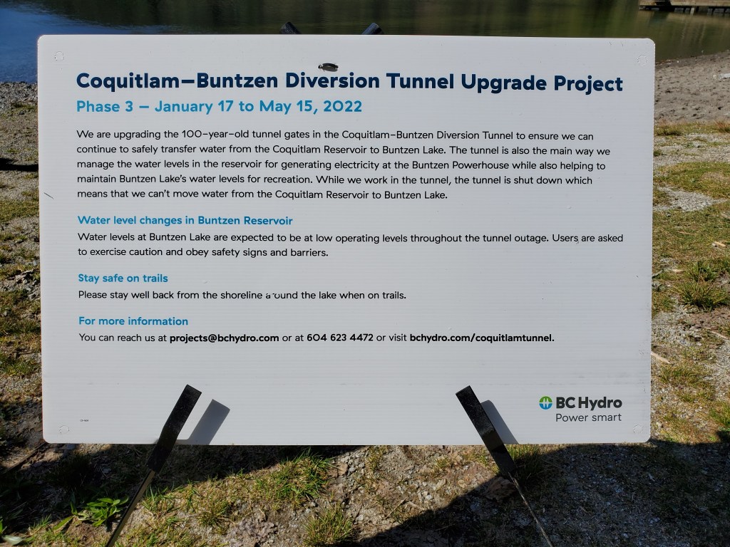 Arriving at Buntzen Lake I decided to do a quick survey of the shoreline and water before setting up my kit. From my previous attempt to paddle Buntzen Lake in March, I had read that the water levels would be low. BC Hydro was upgrading the diversion tunnel between the Coquitlam Reservoir and Buntzen Lake (see image below). So I wanted to ensure that the water levels were navigable.