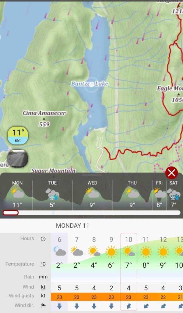 It turns out it would essentially be a synodic moon period. Or a complete cycle of the lunar phases. I had hoped to do a sunset paddle last night and then complete Buntzen Lake over the Easter long weekend. But thankfully, a hail and thunderstorm began before I was out on the water. That put an end to that plan. Instead, I did a grocery run and made dinner for tonight, so I would have the morning to play rather than complete errands and household chores. And it proved to pay off as the passing of last night’s storm resulted in clear morning skies. Though, the forecast on Windy.com did predict gusts of wind. I didn’t know what to expect on the water with the extreme differences between the baseline wind and the wind gusts (see image below). Twenty plus knots of northerly winds would make the northbound portions of the paddle … um, challenging?