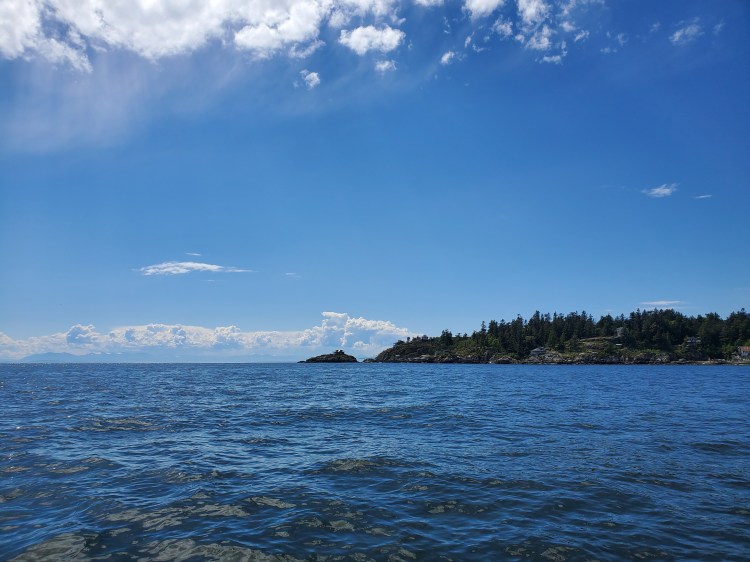 On the west side of Point Atkinson, slightly north, two paddleboarders were resting on their boards in a small cove. My route required me to veer away from the shore. I set my sights on the north end of Passage Island. While it may make for an upwind paddle southward in the Queen Charlotte Channel on the west side of Passage Island, I hoped to take advantage of westerly winds on my return toward Point Atkinson. About halfway between Point Atkinson and Passage Island, I started questioning my decision. The wind and current were more southerly than I had anticipated. Some of the southerly waters surprised me and sent me soaring into the air as I lost my balance and decided to abandon ship and steer clear of the dugout rails of my board. I was happy that I had decided to wear my semi-drysuit despite knowing how hot it would be on board in the sun. The cool water was refreshing as I scrambled back to my board before continuing. I had several more near falls, saved only by paddle slaps and righting reactions.