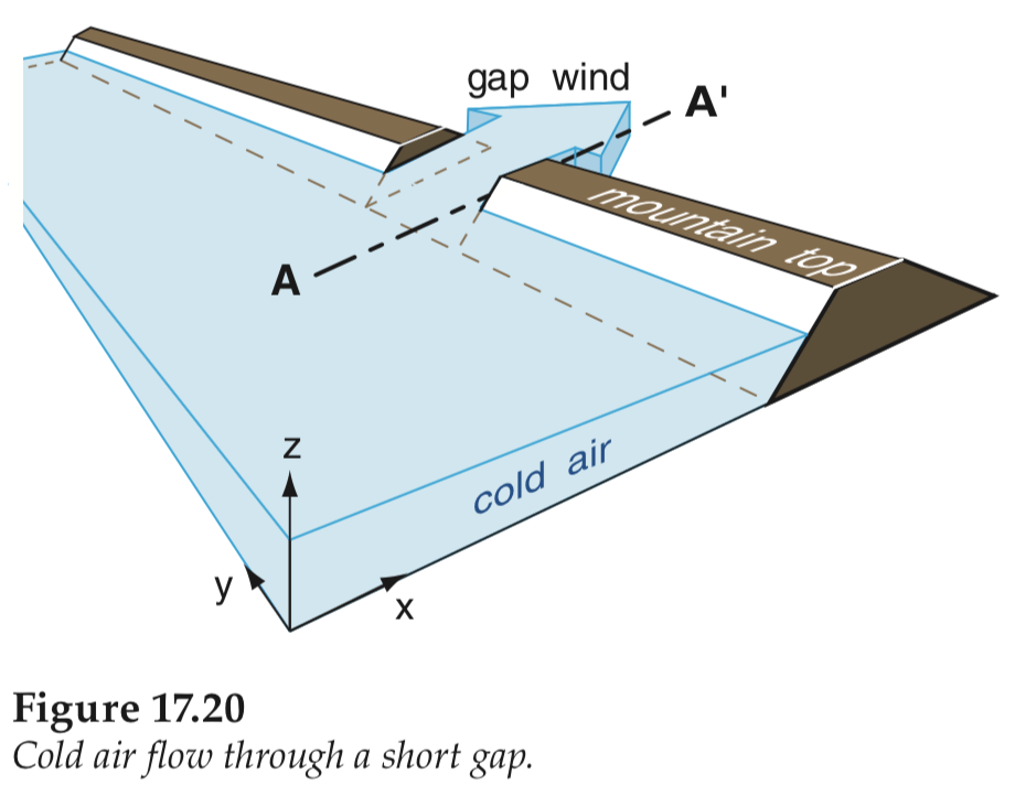 The seasons manifest their effects on the fjords of the west coast. In the summer, the Sun’s increased insolation drives thermal winds over a day/night cycle. During the day, air masses in the interior of BC warm faster than maritime air masses (remember the specific heat of water). Rising air inland thus pulls air from the coast, creating inflows in the fjords. At night the reverse happens. The inland air cools more rapidly (hello again, specific heat) than the maritime air and thus sinks, creating high-pressure zones and outflow winds. The outflowing wind is also coupled with katabatic winds. The katabatic winds occur at night, when air masses over the coastal mountains cool, becoming denser, and fall. The cool, falling air is channeled out toward the coast.