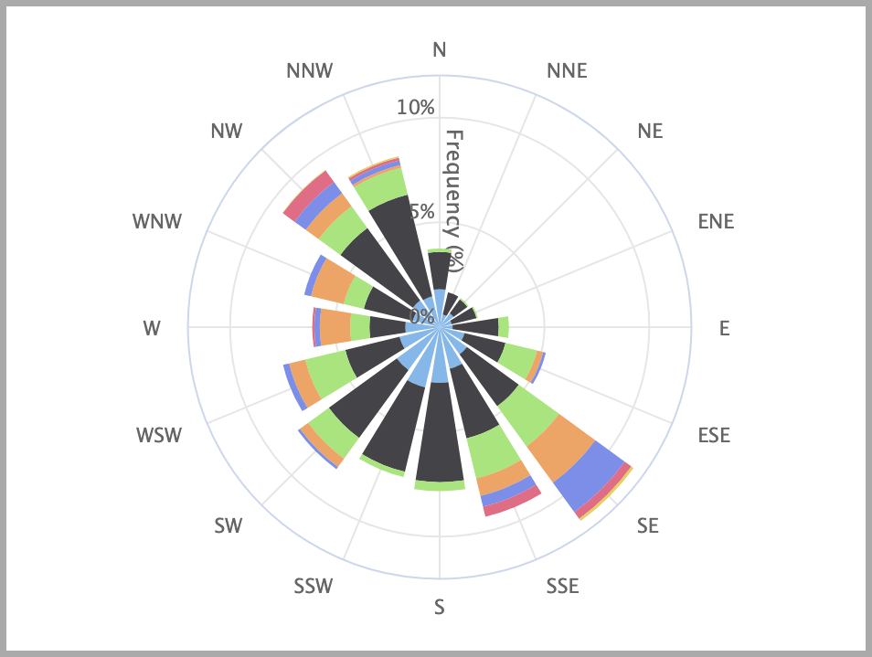 Our current convention of naming wind direction stems from the concept of cardinal directions. The cardinal directions have their origins in the classical compass winds of antiquity. It is from these early abstractions that the idea of the wind rose arises, as the modern meteorological morphing of a compass rose. The modern wind rose is a vector diagram or graphical chart, that illustrates wind speed and direction (see image below).